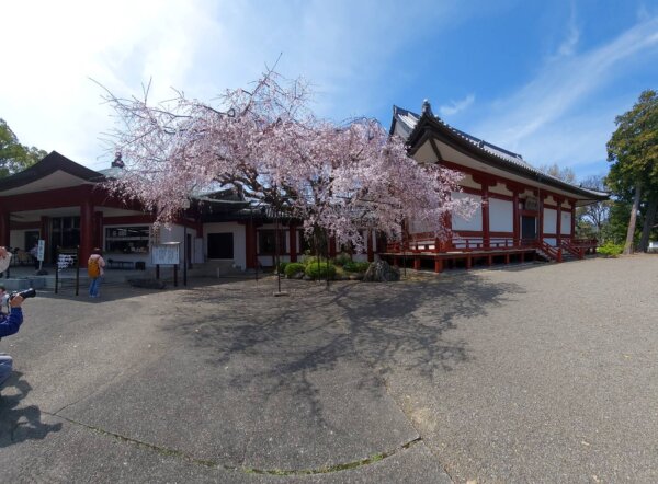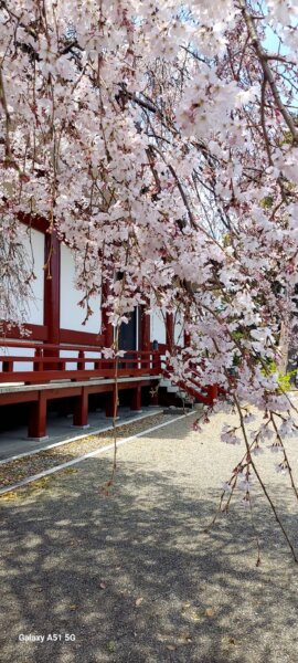 朱塗りの建物と 桜が とてもきれいです。